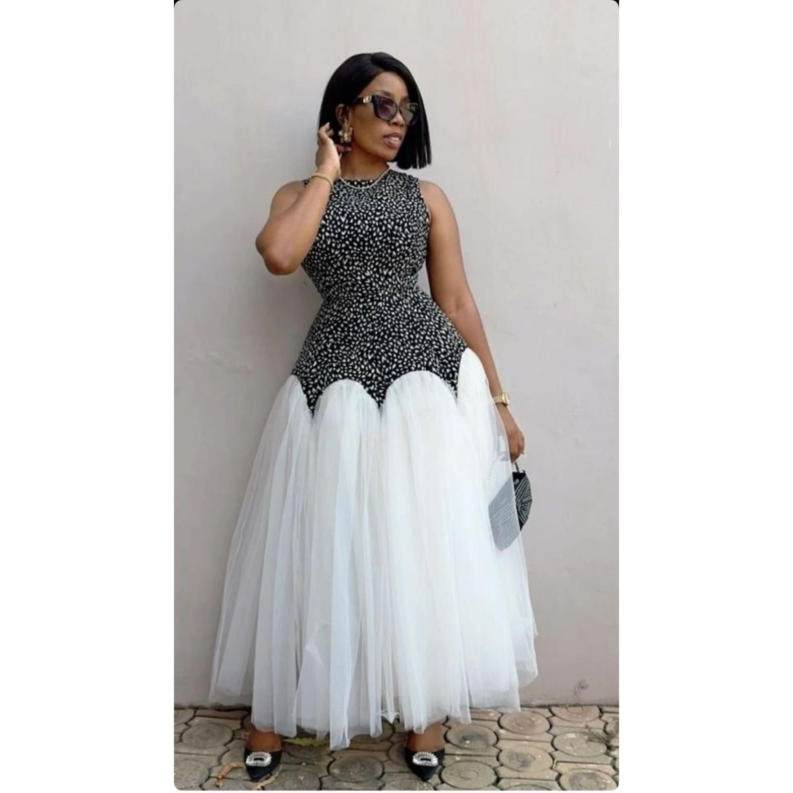 Sleeveless Mermaid Tule Dress. This stunning dress features a form-fitting mermaid silhouette and a sleeveless design made with high-quality tulle fabric. It's a versatile and stylish choice for any special occasion, allowing you to make a statement with elegance and grace.