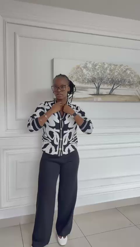 Elevate your loungewear game with this sophisticated two-piece knitted set. Featuring a V-neck button-down cardigan with long sleeves paired with comfortable wide-leg pants, both adorned with an eye-catching abstract brushstroke print. Perfect for relaxed days at home or casual outings, this versatile cordset effortlessly transitions from bedroom to street. The soft knit fabric offers warmth and breathability, while the coordinated design ensures an instantly polished look without compromising on comfort.