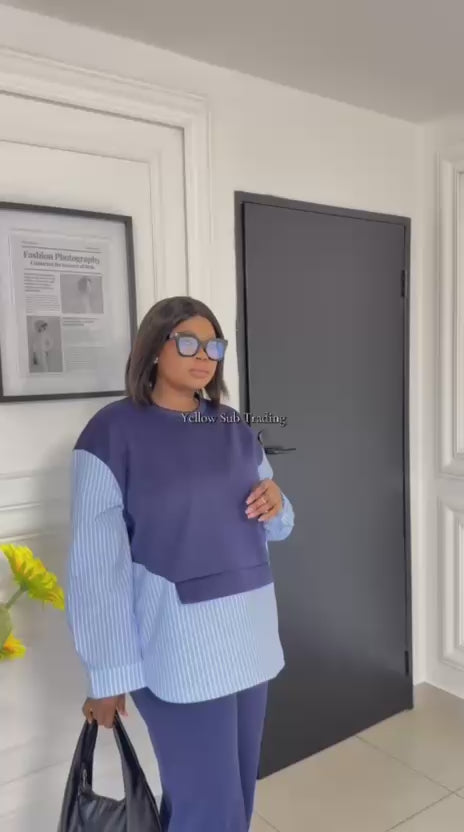 Elevate your everyday wardrobe with this versatile striped two-piece set that effortlessly combines comfort and contemporary style. The thoughtfully designed ensemble features a relaxed-fit sweatshirt top with a distinctive striped patchwork detail and classic round neckline, complemented by structured high-waisted wide-leg trousers that elongate your silhouette and flatter every frame. Perfect for creating polished casual looks, this coordinated set takes the guesswork out of styling while offering endless outfit possibilities. The long sleeves and quality construction ensure durability through countless wears, while the carefully curated color palette—including beige, grey, black, red, and navy blue—makes it easy to find your perfect match.