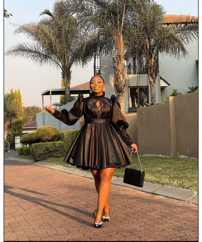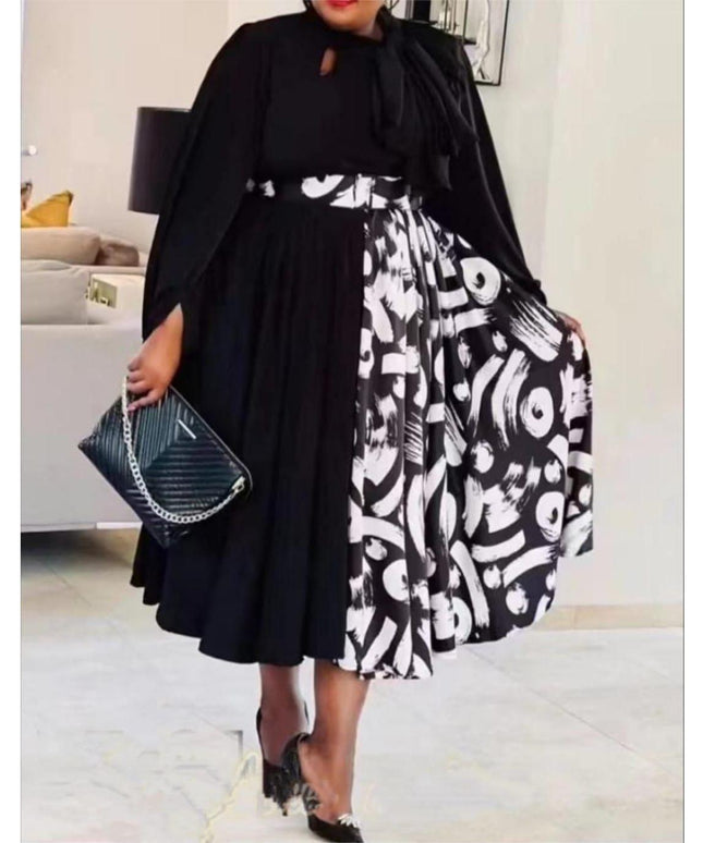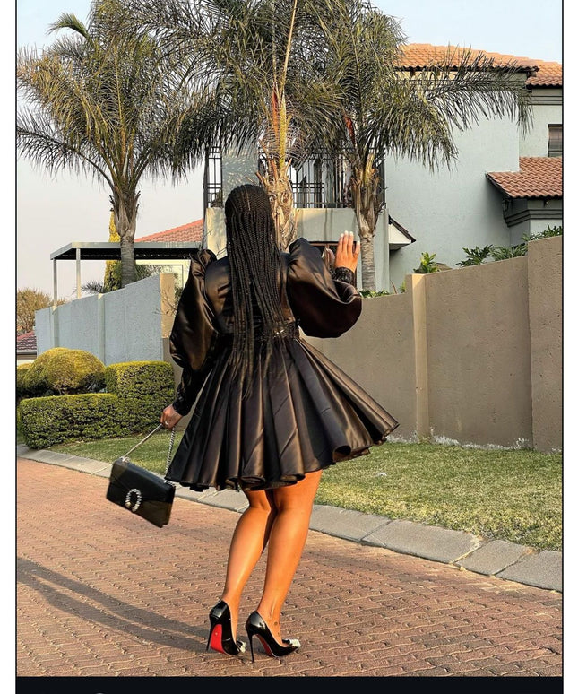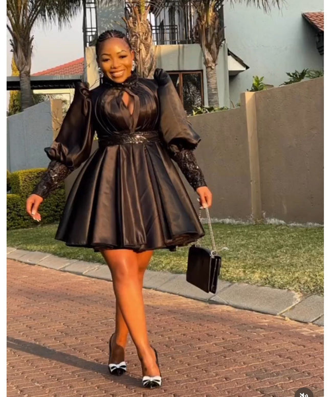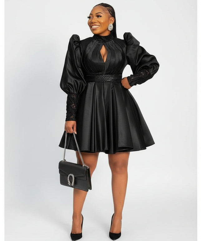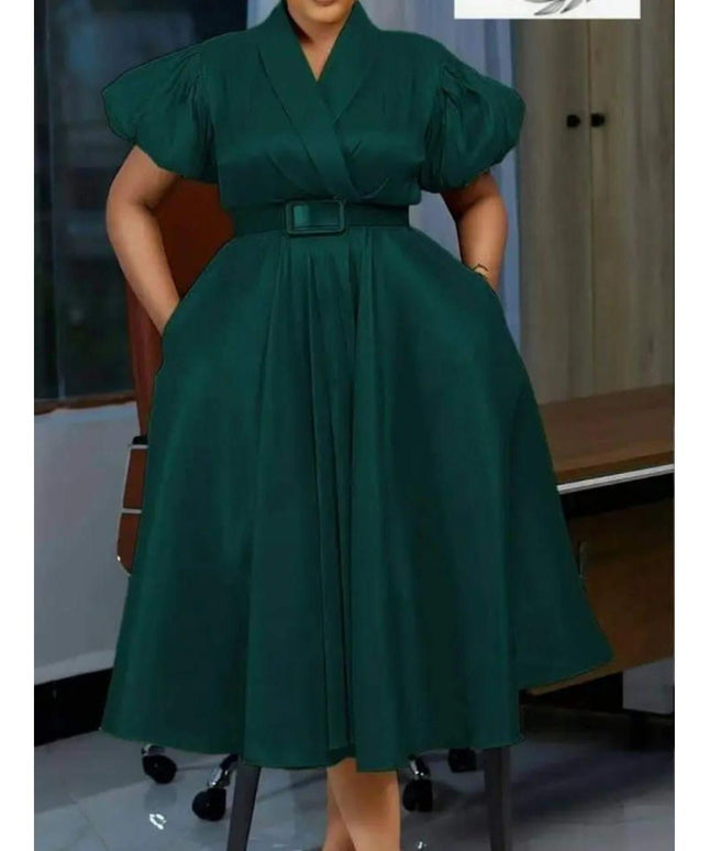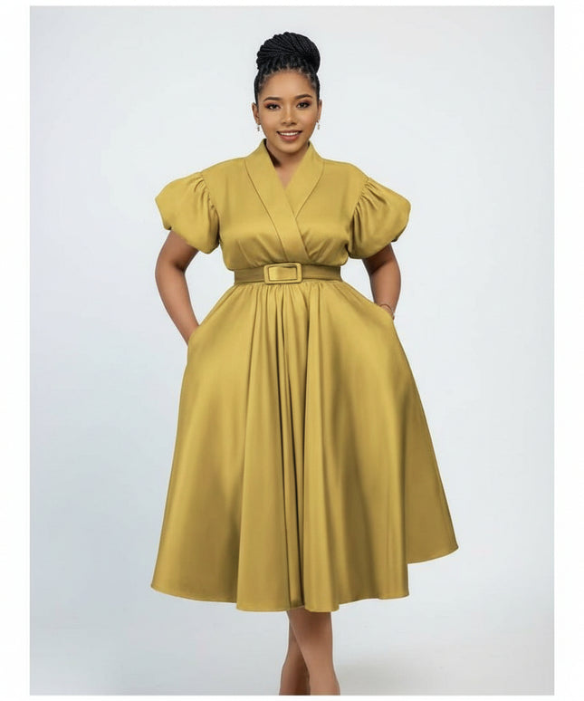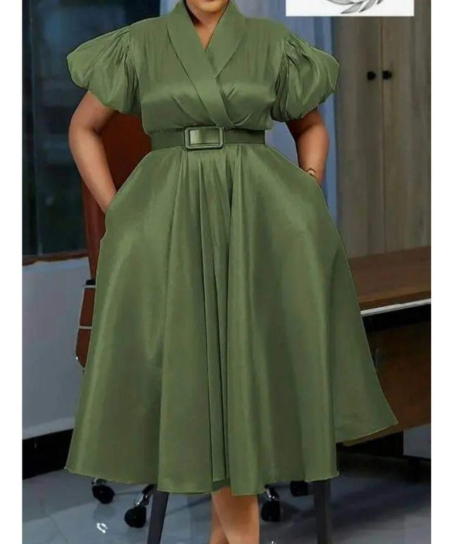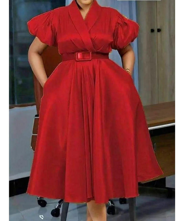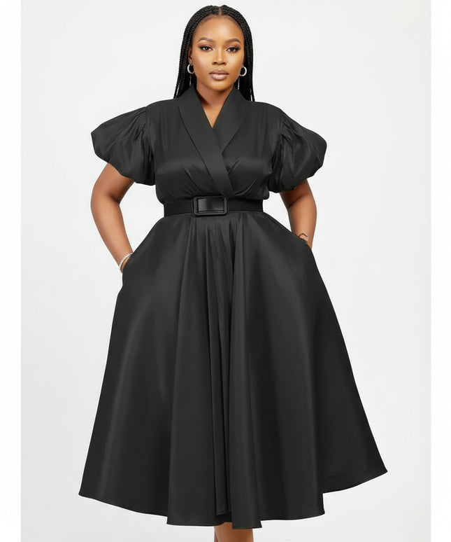 Elegant Plus Size Puffy Sleeve Pleated Hem Dress