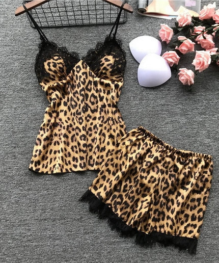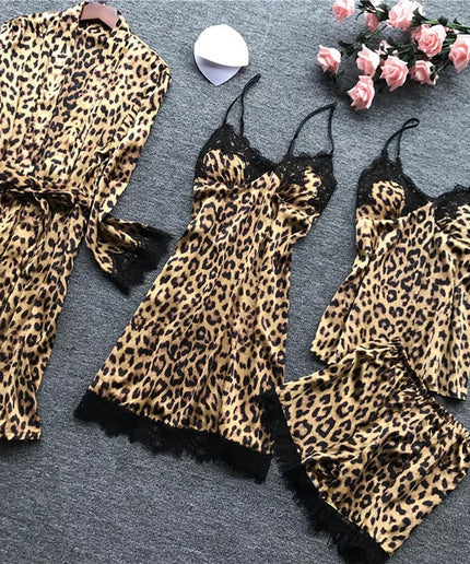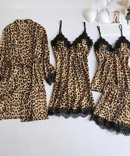 This stylish satin sleepwear set is the perfect way to stay modern and comfortable. Featuring a sleek leopard print and made of silky luxurious fabric, these 4 pieces provide a sexy, comfortable look for a good night's sleep.