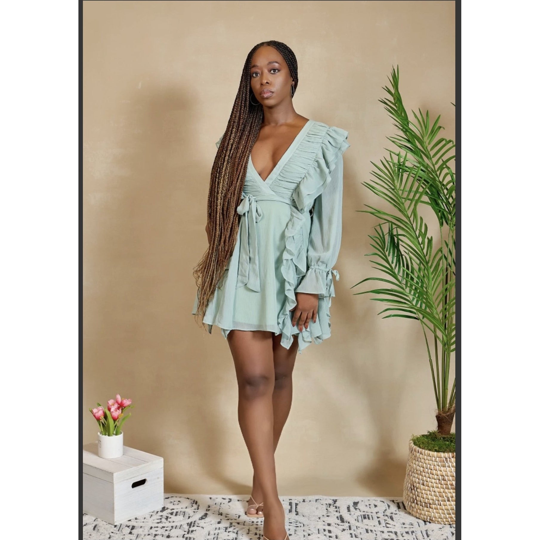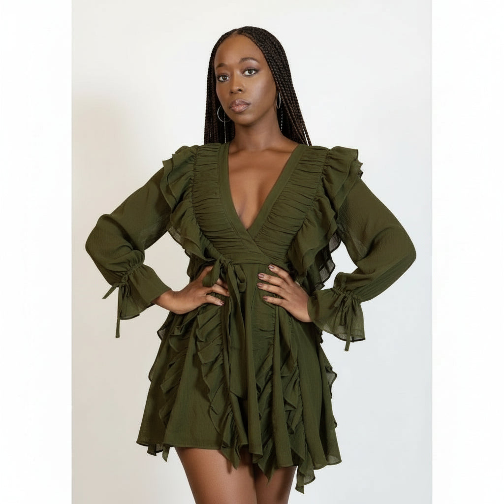 All Over Ruffle Mini Dress This dress is designed with delicate ruffles all over, providing a feminine and elegant look. The subtle details make it perfect for any occasion, adding a touch of sophistication to your wardrobe. You'll love the timeless and versatile style of this mini dress, allowing you to effortlessly dress it up or down.