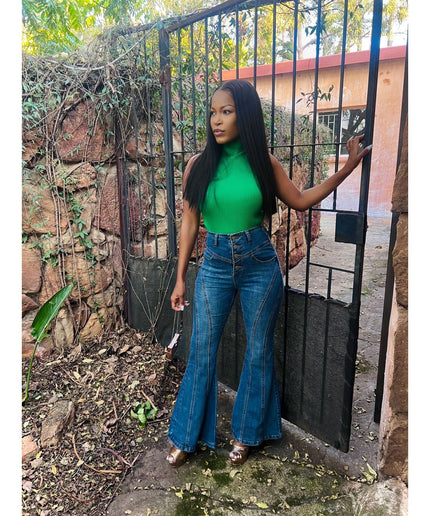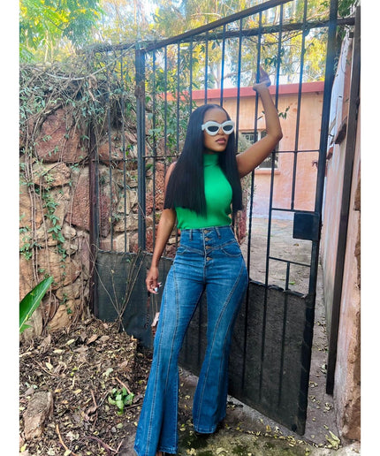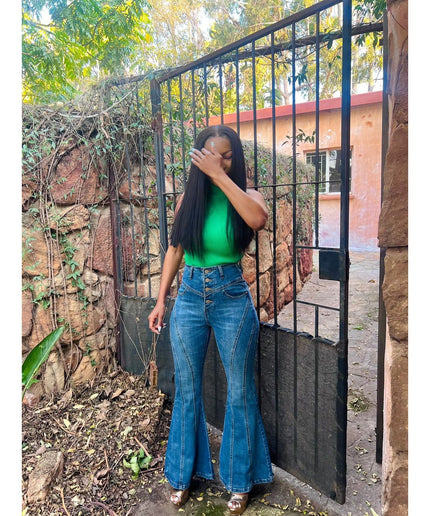 Bellbottom Boyfriend High Waisted Jeans. Upgrade your wardrobe with these stylish and functional jeans. Made with a high-waisted design, these jeans offer comfort and support while giving you a trendy and flattering look. Perfect for any occasion, these jeans are a must-have for any fashion-forward individual.