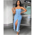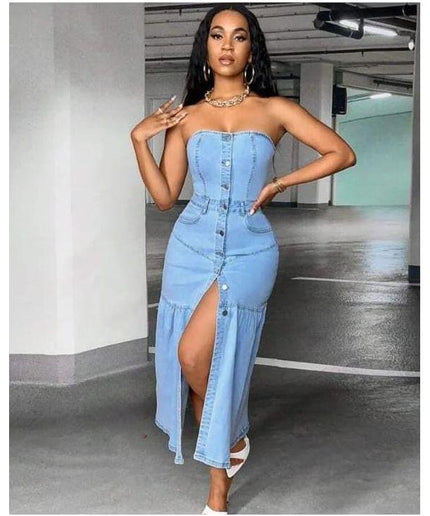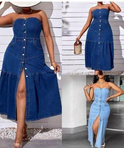 Introducing our Buttoned Front Tube Denim dress, the perfect combination of style and elegance. Made from high-quality denim, this modern dress features a buttoned front design that adds a touch of sophistication to your wardrobe. Embrace fashion-forward trends while maintaining a professional and polished look.