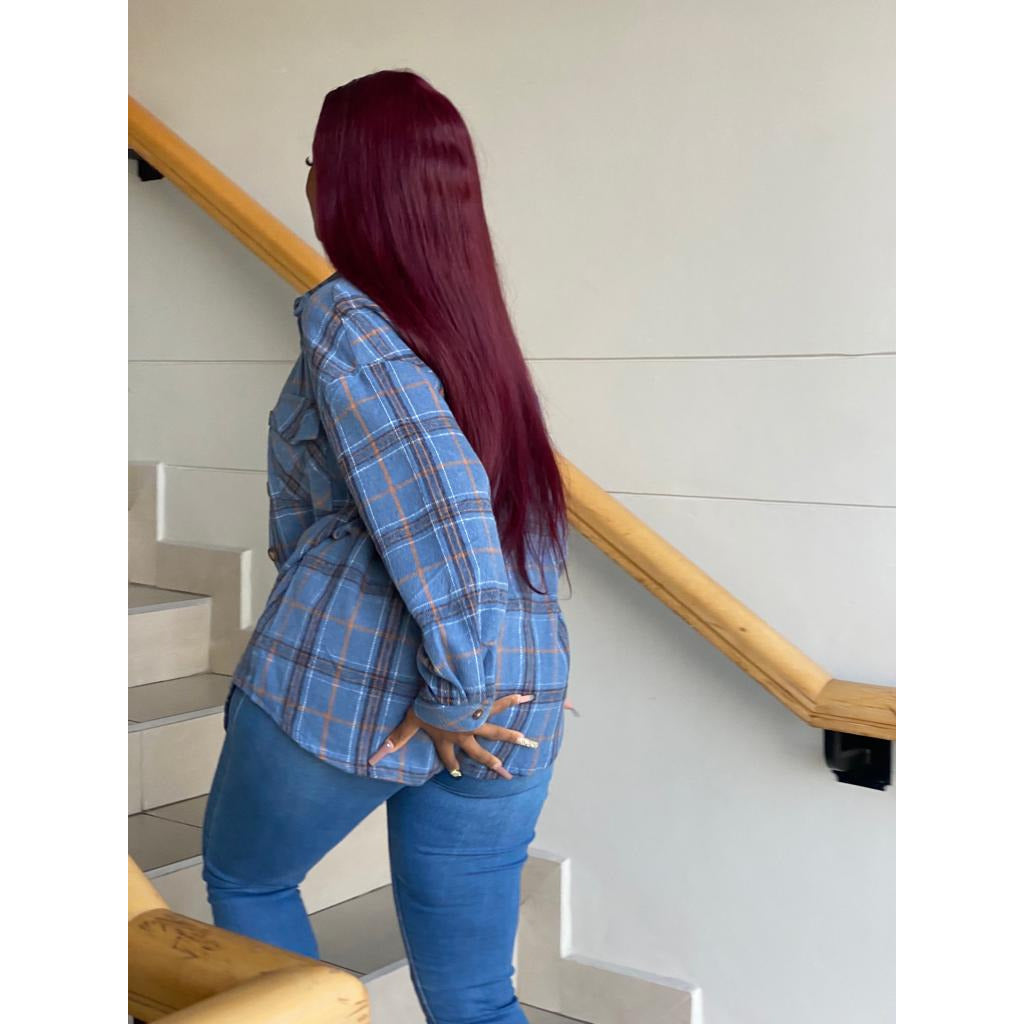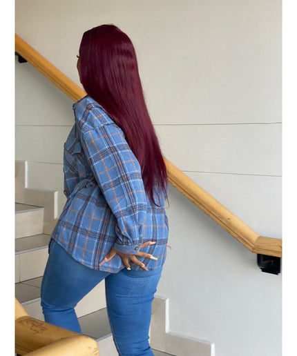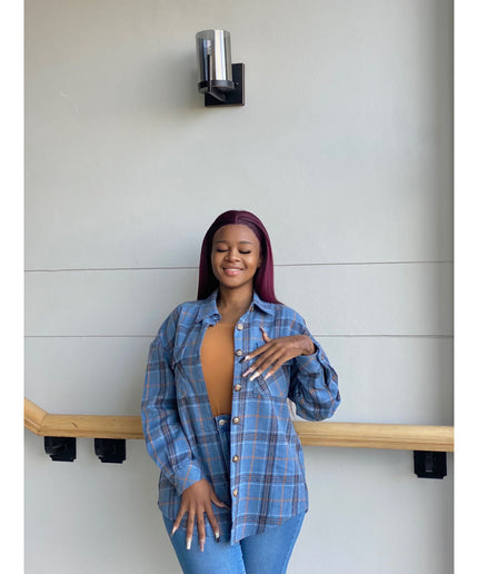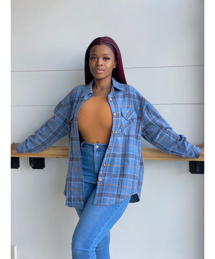 This plaid-patterned long sleeve shirt is perfect for cooler weather. Crafted from a warm fabric, it also features two front pockets for convenience. Its classic plaid pattern and collared neckline add a timeless touch of style.