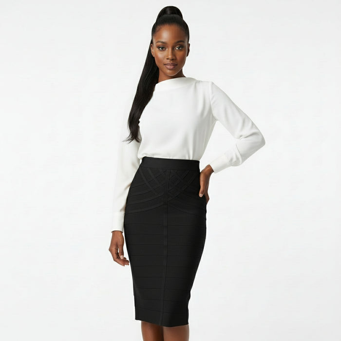 Rock a modern look in this high waist, bandage skirt. Crafted from striking fabric, it's designed to flatter with its classy, fashion-forward silhouette. Perfect for any occasion, add a high-end finish to your wardrobe.