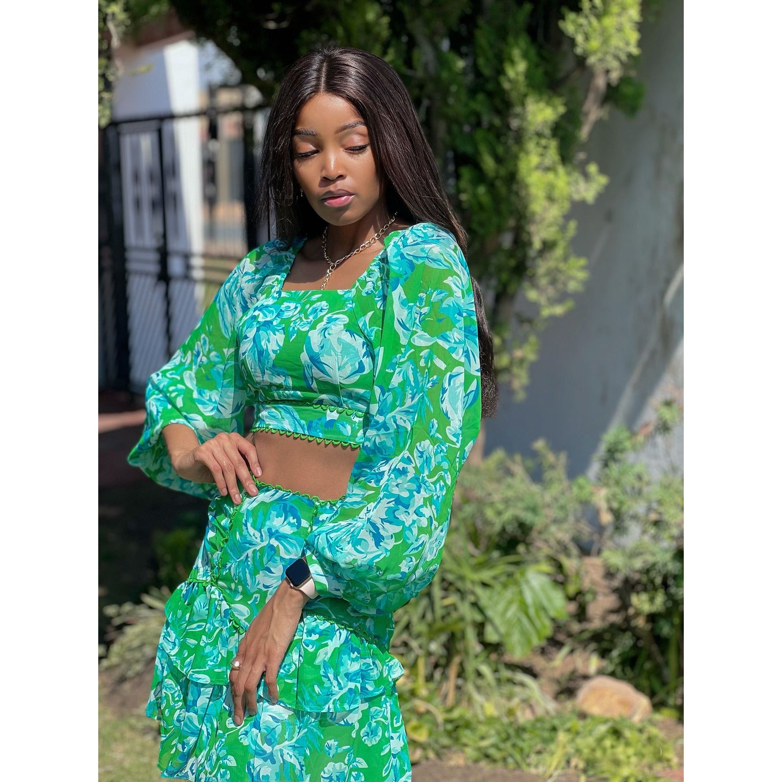 Deep V neck Lantern Sleeve chiffon shirt two-piece set