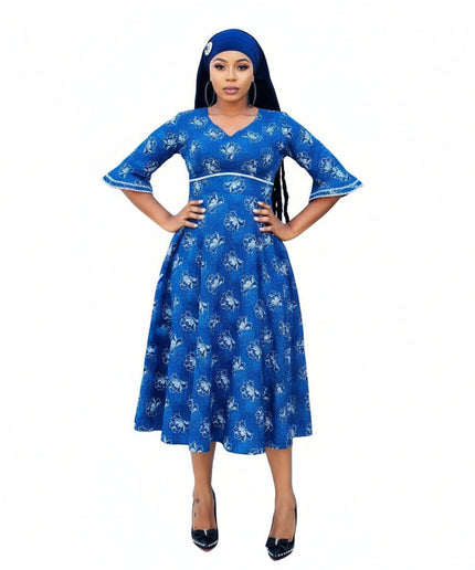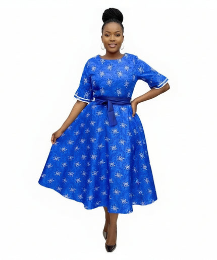 Elegant Flared Shwe-shwe Midi Dress. With its timeless design and carefully crafted details, the Elegant Flared Shwe-shwe Midi Dress is a versatile addition to any wardrobe. Made from high-quality imported fabric, this dress is lightweight and breathable, providing ultimate comfort and style. Whether you're attending a formal event or simply looking for a chic everyday outfit, this dress is sure to impress.