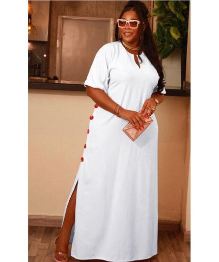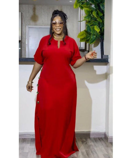 Featuring a flattering drop down v-neck and a comfortable short sleeve design, this maxi dress is perfect for any occasion. The elegant slit detail adds a touch of sophistication, making you stand out in any crowd. The versatility of this dress allows you to easily dress it up or down, making it a staple piece in your wardrobe.