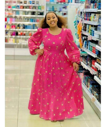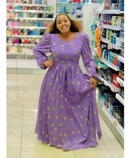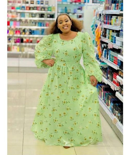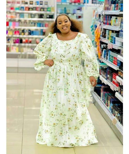 Square Neck Floral Textured Flare Waist Long Sleeve Dress
