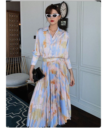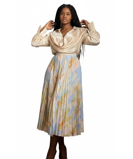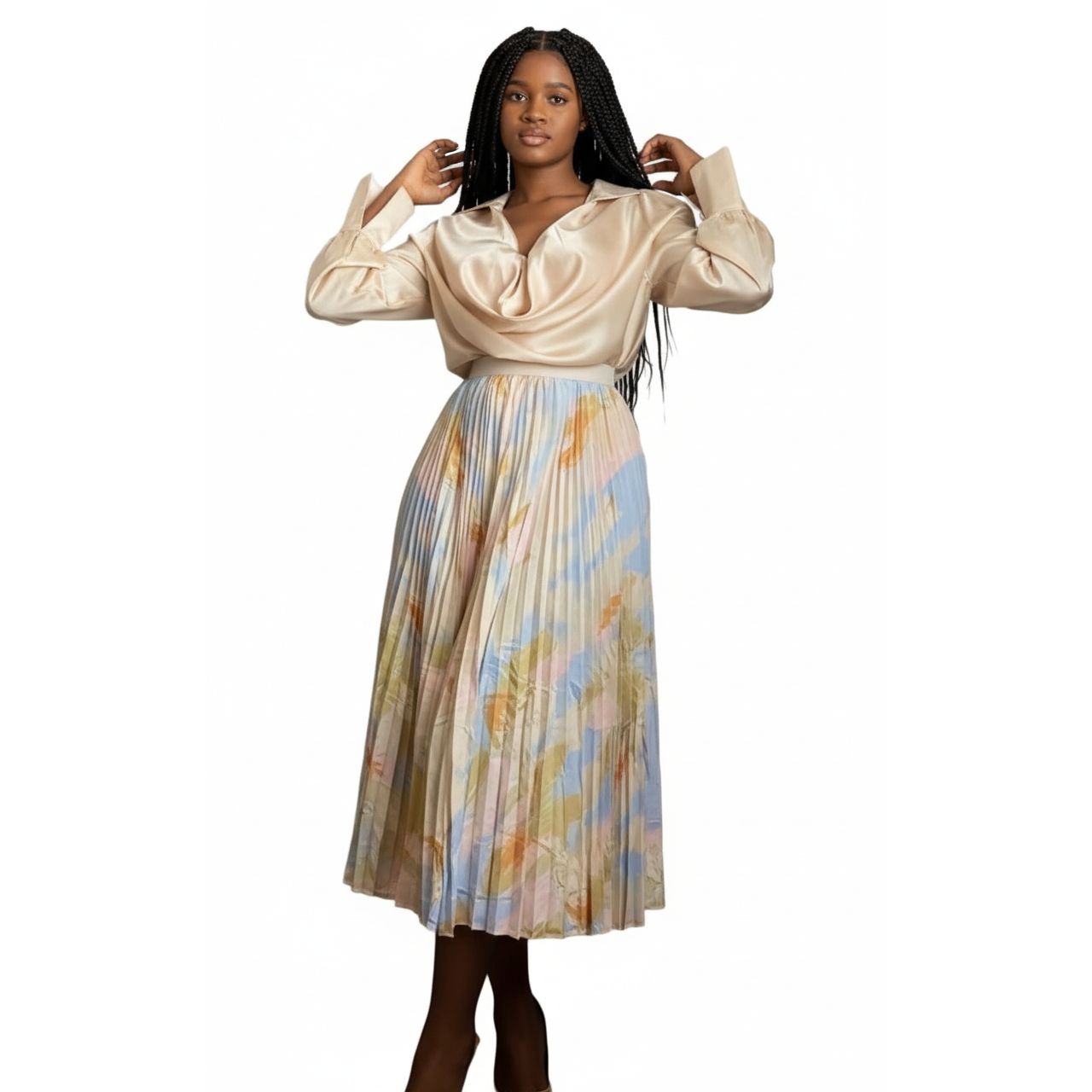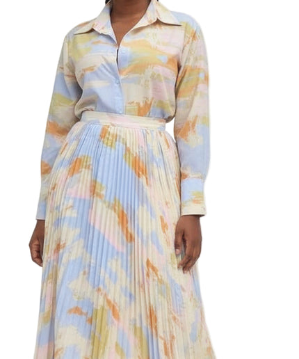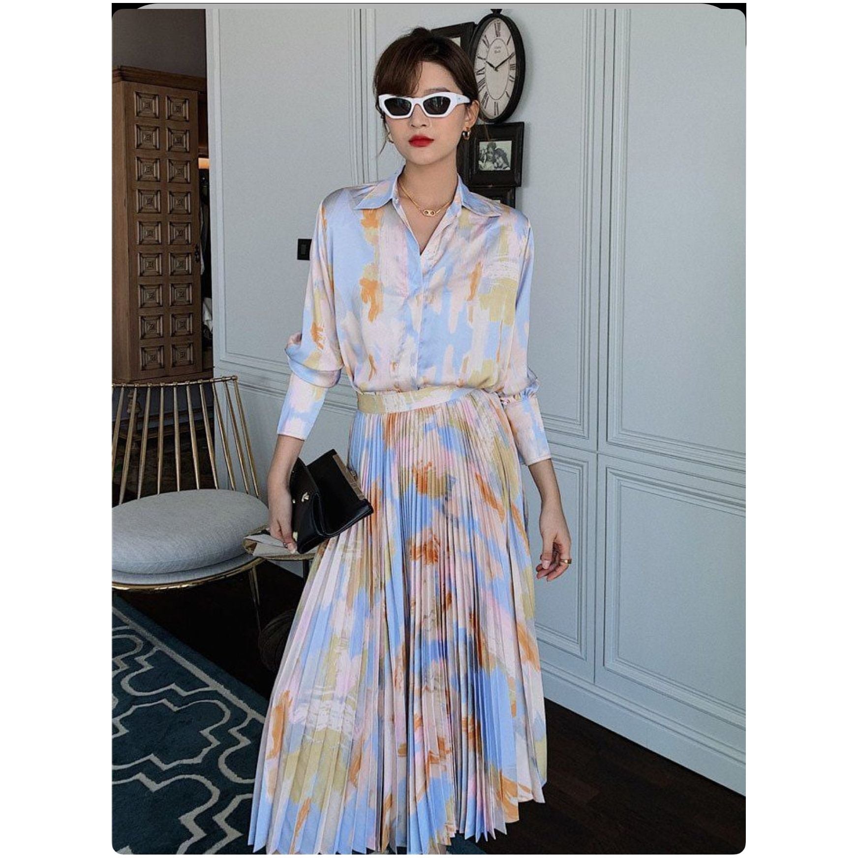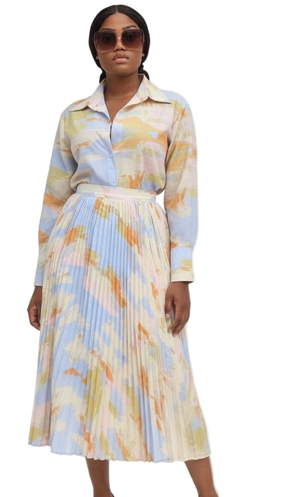Floral Maxi Two Piece Set. This beautiful two-piece set features a floral button long sleeve shirt and matching skirt, making it versatile for casual events or more formal occasions.
