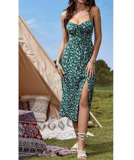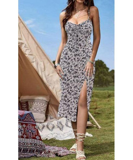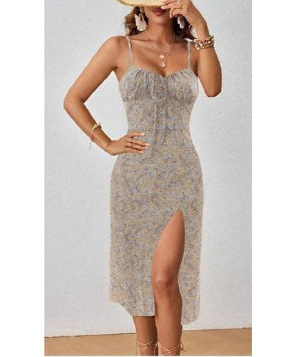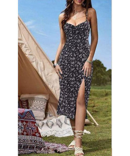 Crafted from lightweight, breathable fabric, this Floral Print Strap Shoulder Slit Midi Dress offers both style and comfort. With its floral print design and delicate shoulder straps, it's an elegant choice for any occasion. Plus, the midi length and subtle slit add a touch of sophistication.