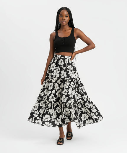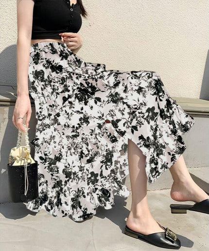 Expertly crafted with soft and lightweight fabric, this skirt exudes femininity and elegance. Its flowy and ruffled hemline is designed to flatter your figure and add a touch of charm to your wardrobe. With its gorgeous floral print, it's the perfect piece to elevate any outfit.