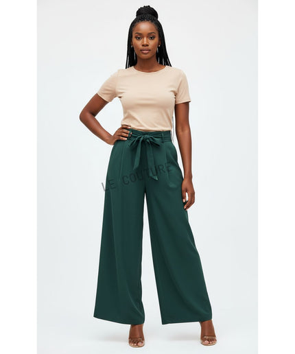 High Waist Plicated Detail Bow Front Wide Leg Pants
