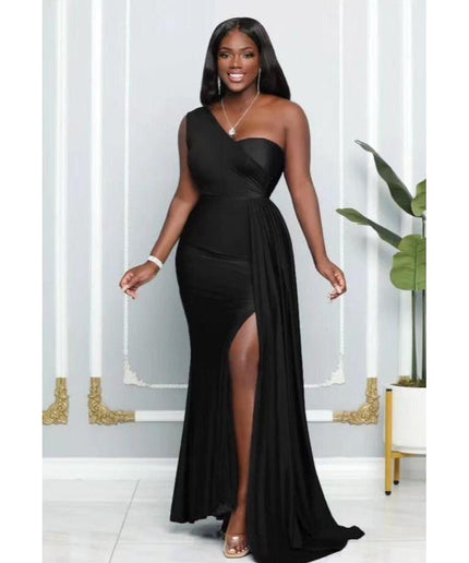 This elegant and modern maxi dress features a one off shoulder design and a stylish slit that accentuates the waistline. With this unique silhouette, you can look and feel your best at your next special occasion!
