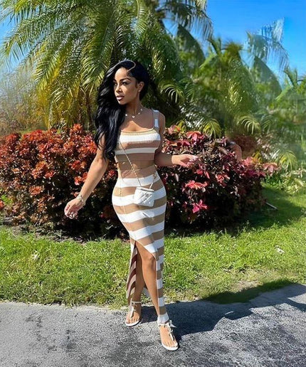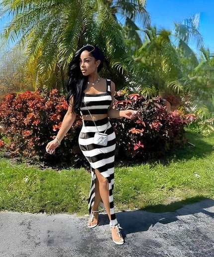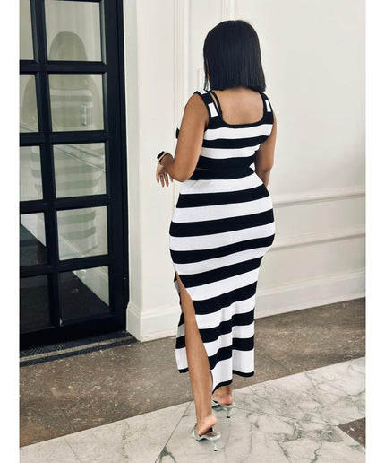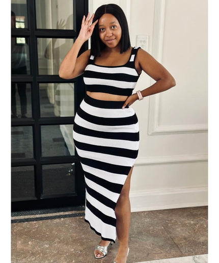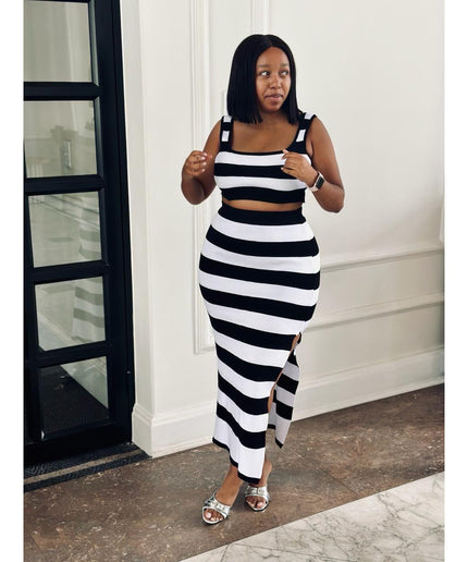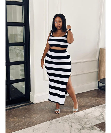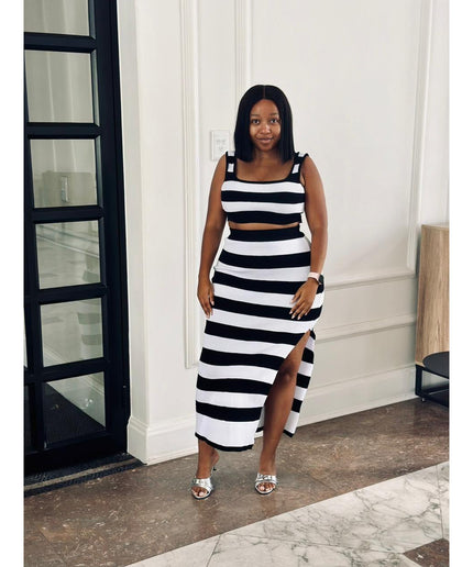 This knitted striped set combines quality and style in an elegant and fashionable manner. The perfect addition to your wardrobe for a timeless and chic look. Crafted with high-quality materials for long-lasting wear.