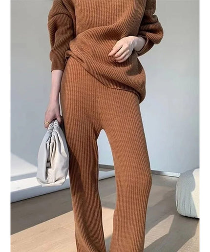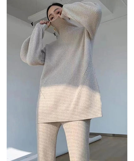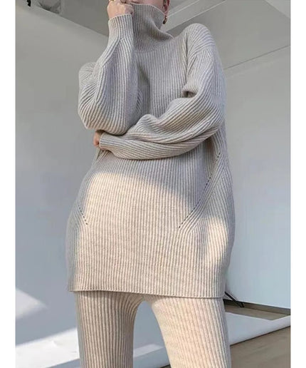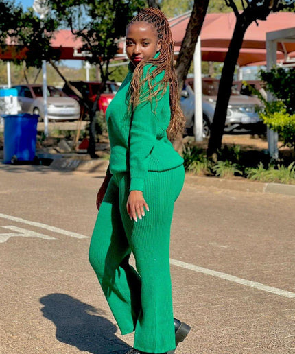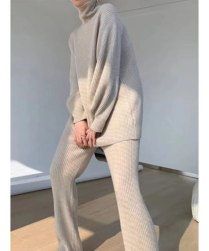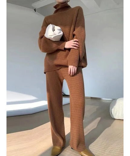 Look sophisticated in this modern knitted sweater and wide pant set. Its knitted fabric provides warmth and comfort, while its turtleneck sweater and wide pant fit ensure a fashionable look. Perfect for any special occasion.