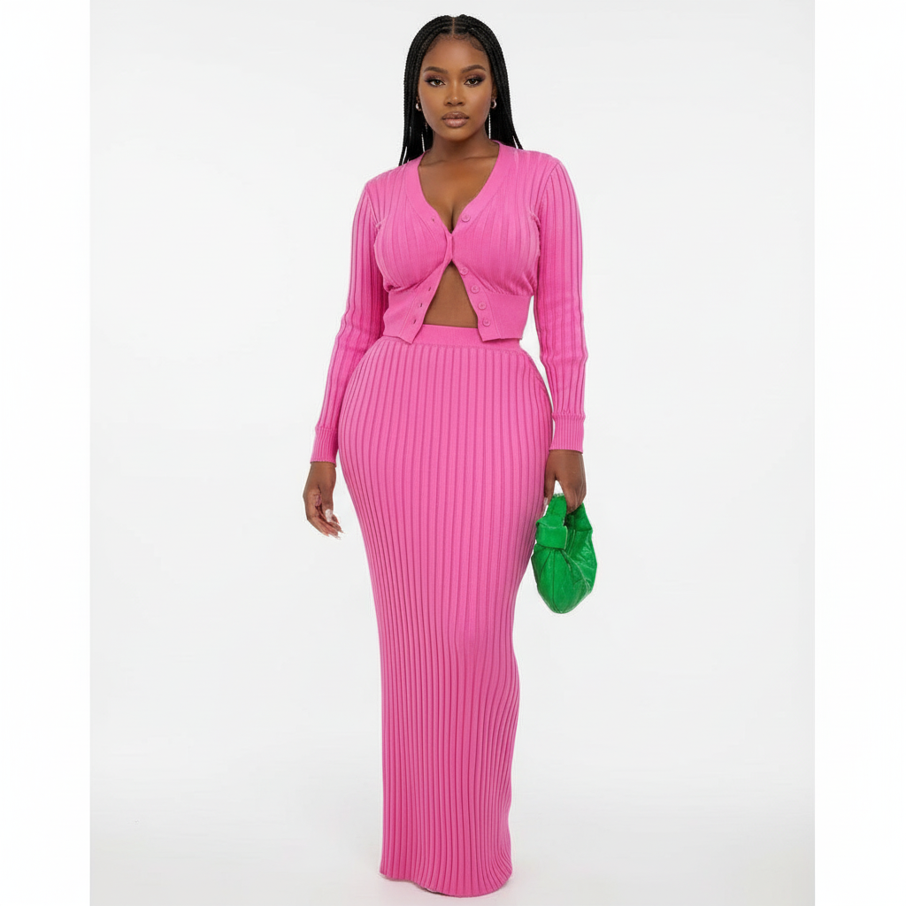 Stay on trend with our stylish Knitted V-Neck Crop Top and Skirt Set. Made with high-quality materials, this modern set is perfect for any occasion. The knitted fabric adds a touch of luxury, while the V-neck crop top brings a hint of playfulness. Elevate your wardrobe with this must-have set.