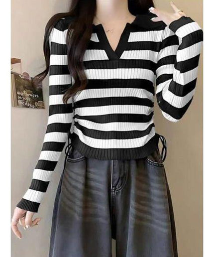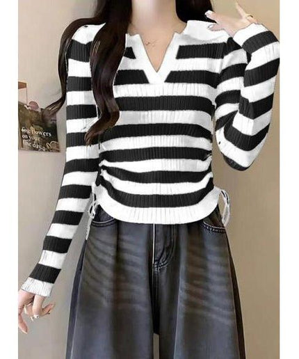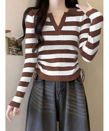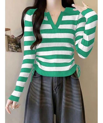 Experience quality and elegance with our Knitted V-Neck Striped Top. Made with modern design and a comfortable knitted material, this top is perfect for any occasion. The V-neck adds a touch of sophistication to your outfit. Upgrade your wardrobe with this versatile and stylish top.