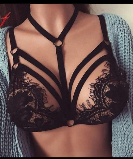 Lace Floral Hollow Halter Bralette Bra This bra is designed with a delicate floral lace pattern to provide breathable comfort and a captivating look. It features hollow-out straps for breathability, and adjustable halter straps for a customized fit.