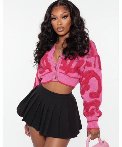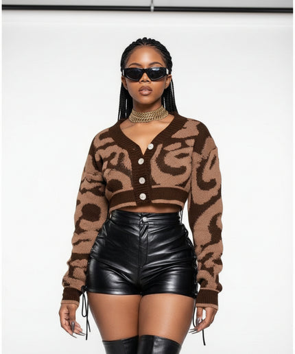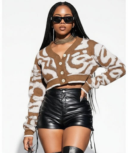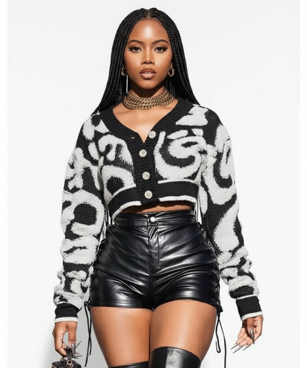 Revamp your wardrobe with this stylish cropped cardigan. Its V-neck design and graffiti print add a touch of modern flair to any outfit. And with long sleeves and a button down knit, it will keep you warm and comfortable all day long. A must-have for those looking to elevate their fashion game.