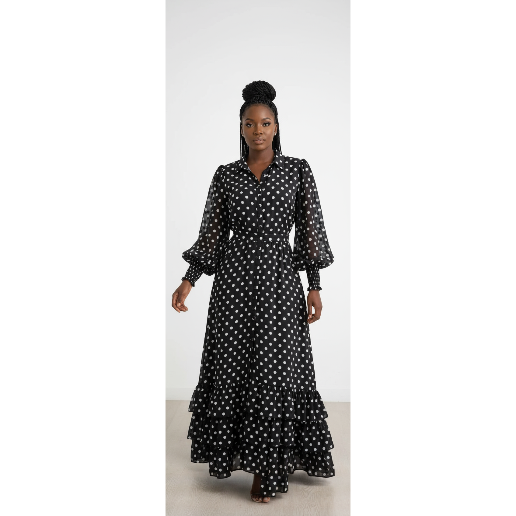 This dress features a classic polka dot pattern and long sleeves, making it a versatile addition to your wardrobe. It's made with high-quality material, ensuring comfort and durability. Plus, the timeless design will never go out of style, making it a smart investment for any fashion-savvy individual.