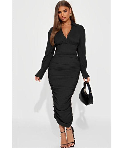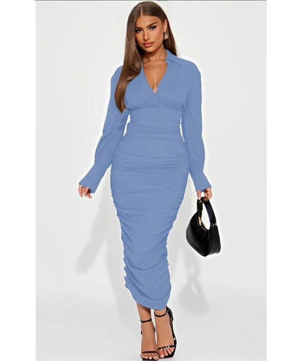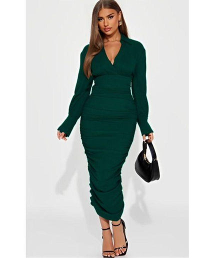 This elegant V-neck dress boasts stylish and modern features with its long sleeves, perfect for any occasion. Made from premium materials, it exudes sophistication and timeless appeal. Elevate your wardrobe with this versatile and chic piece.