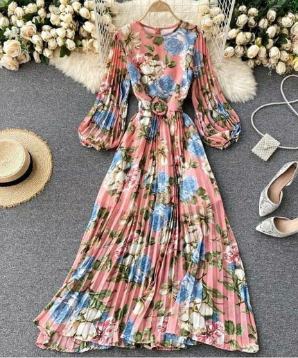 Long-sleeved Spring Summer Fashion Printing Belted Dress. This dress is designed to flatter any body type with its belted waist, making it perfect for any occasion.