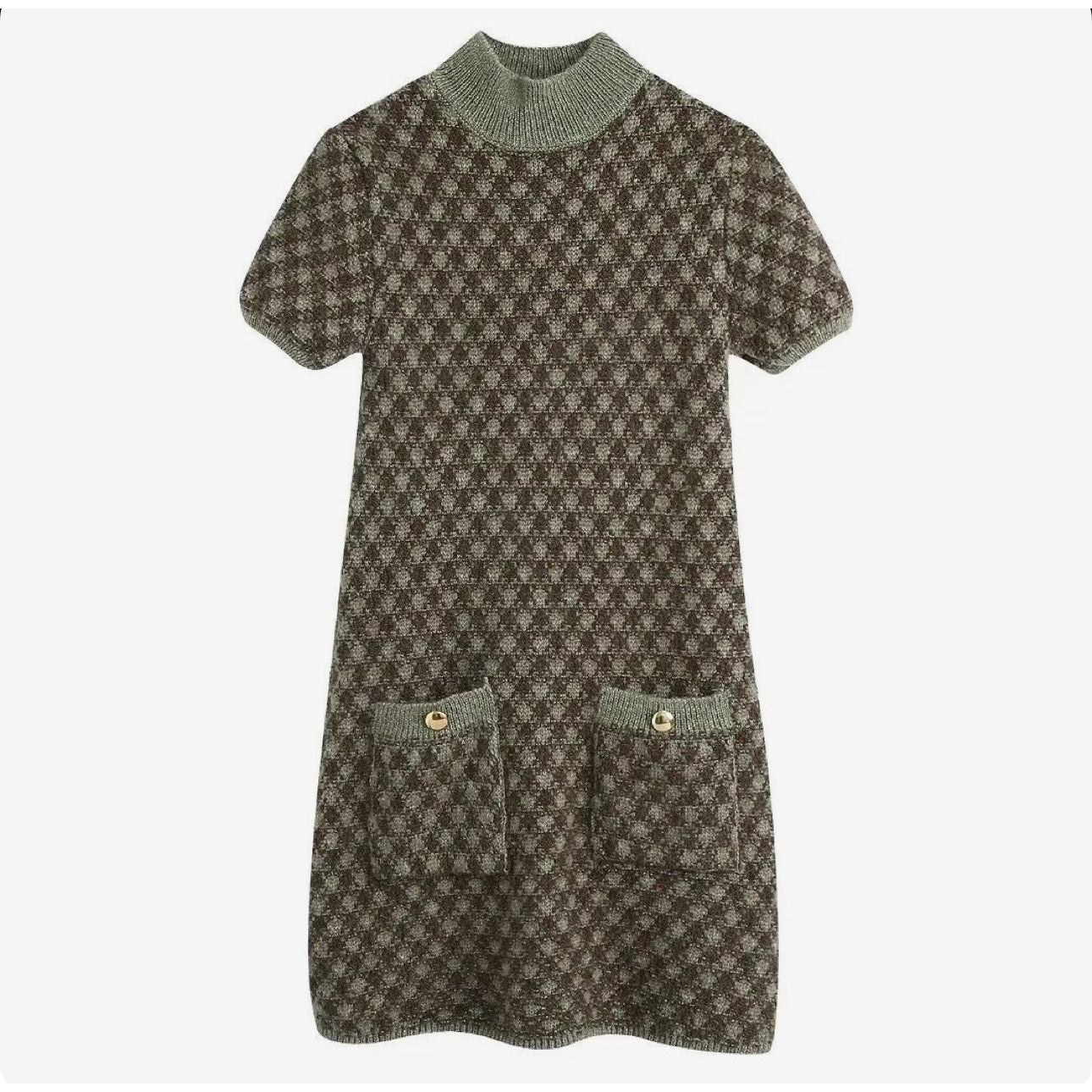 Mock-Neck Plaid Knit Mini A-Line Dress