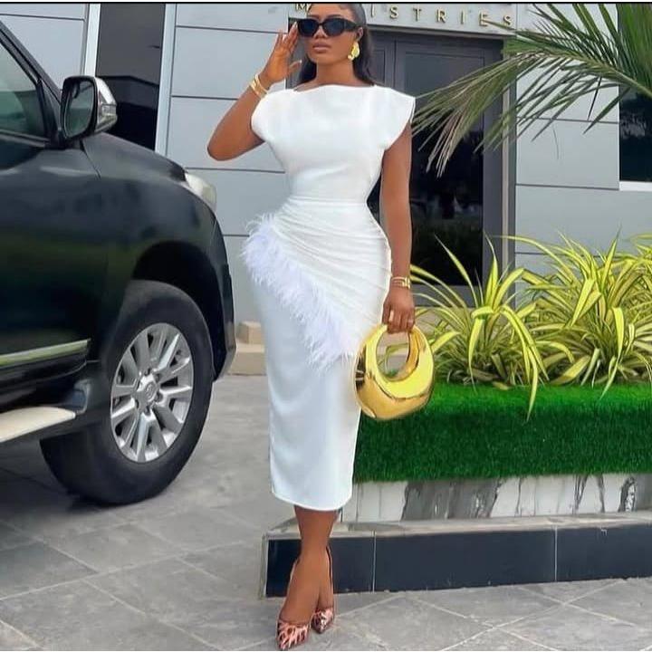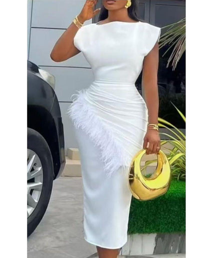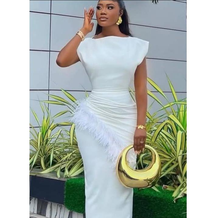 This dress is crafted with a slim fit design, allowing for a flattering and elegant silhouette. The feather patchwork adds a unique and stylish touch, making it a versatile piece that can be worn for various occasions. Its O-neck design also offers a classic and timeless look. With this dress, you'll feel confident and fashionable while showcasing your personal style.