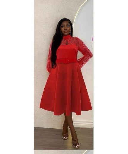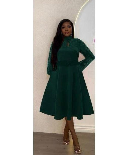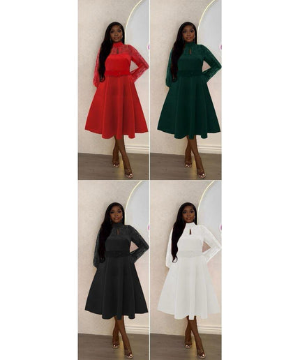 This dress features an elegant O-neck, intricate lace patchwork, and long sleeves, making it a versatile and stunning option for any party. With a flattering high waist and a classic A-line silhouette, this dress is designed to enhance your curves and provide a comfortable fit. The knee length hemline adds a touch of sophistication, making this dress a perfect choice for any formal event.