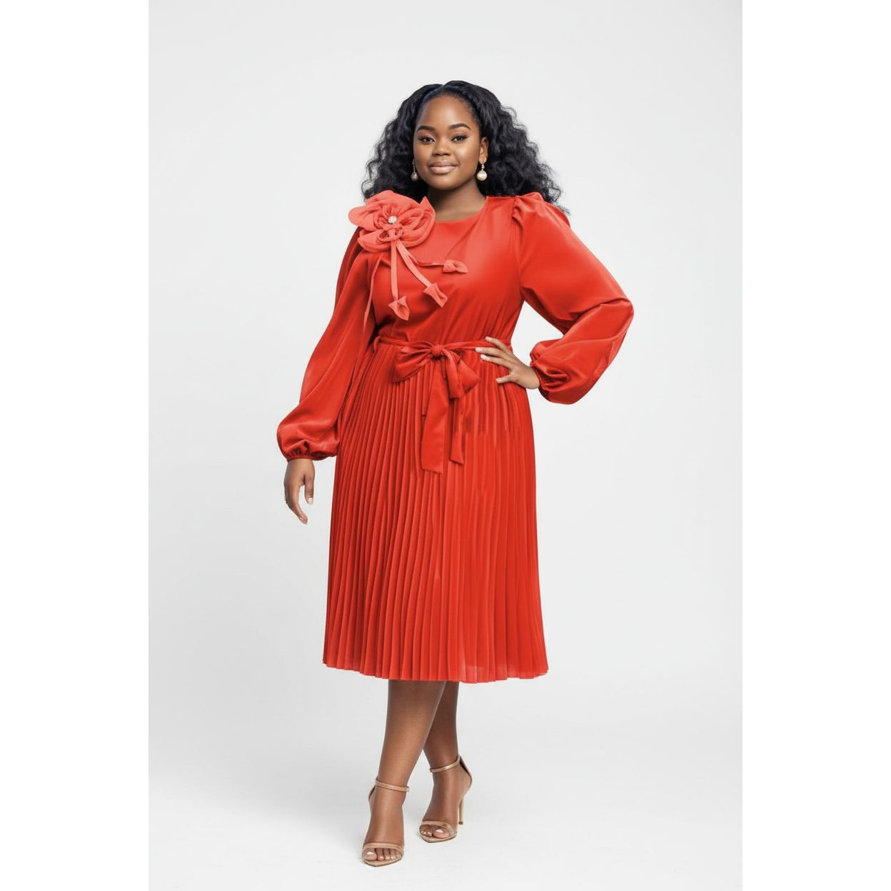 Elevate your wardrobe with this stunning Plus Size Pleated Midi Puff Sleeve Dress, designed to celebrate your curves with confidence and style. The voluminous puff long sleeves add a touch of romantic elegance, while the precisely pleated midi skirt creates beautiful movement and dimension with every step. A coordinating waist belt cinches at just the right spot to define your silhouette and enhance your natural shape. The charming floral accent adorning the shoulder brings a delicate, feminine detail that catches the eye.
