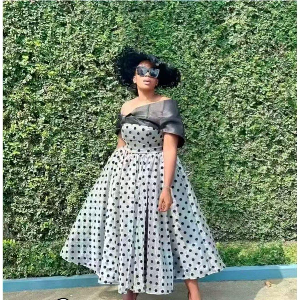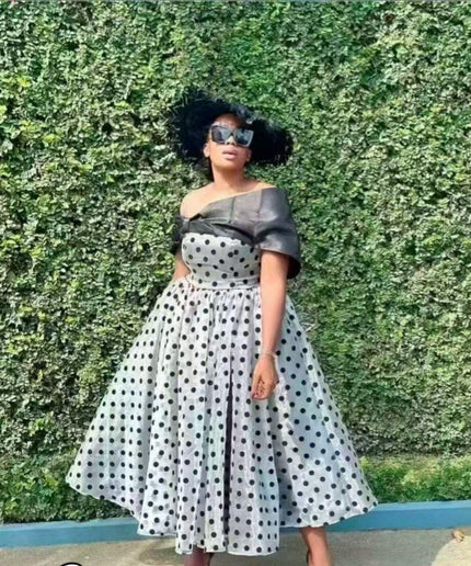 Look stunning in this classic polka dot off shoulder dress. The lightweight fabric allows for a comfortable fit while the elastic neckline keeps the dress in place. Perfect for any occasion, this dress will have you feeling confident and chic.