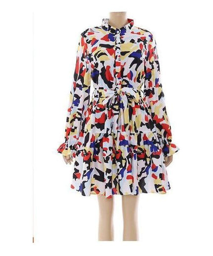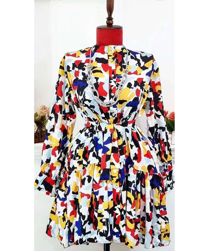 Print Lantern Sleeve Fold Pleat Curved Hem Dress.