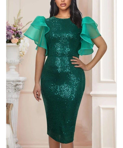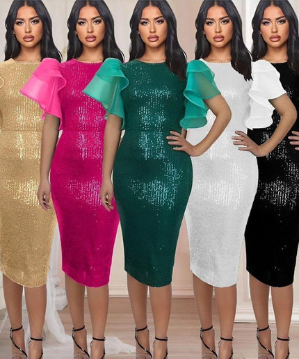 This round-neck ruffles short sleeve bodycon dress offers a stylish and modern design that exudes elegance and fashion-forward appeal. With high-quality construction, it's a must-have for any wardrobe. Upgrade your look with this fashionable dress.