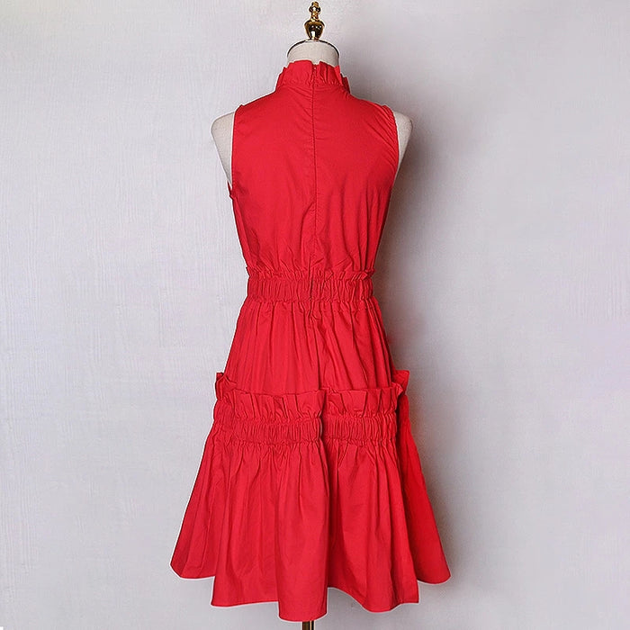 Casual Patchwork Ruffles Dresses Stand Collar Sleeveless High Waist Ruched Dress