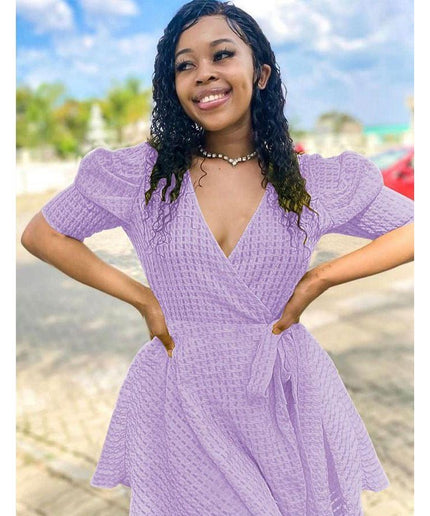 Stay trendy in this Short Sleeve V-Neck Dress. Crafted from quality materials, it features a fashionable V-neck and short sleeve design—allowing you to look stylish in any occasion.