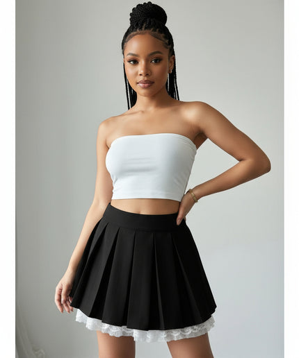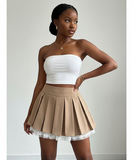 With its delicate lace trim and flattering pleated design, this mini skirt is a must-have for any fashion-forward wardrobe. It effortlessly adds texture and movement to your ensemble, making it a versatile piece that can be dressed up or down for any occasion.