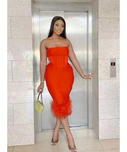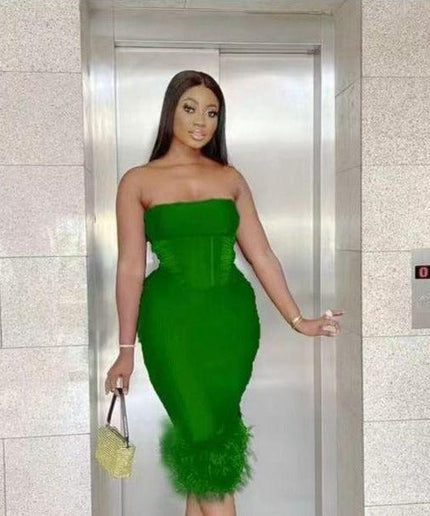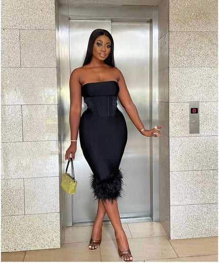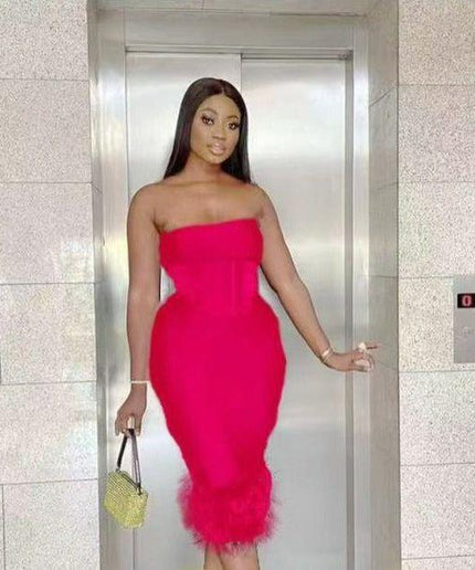 This Sleeveless Feather Bodycon Dress gracefully blends style and comfort with its luxurious feather detailing and form-fitting silhouette. A perfect addition to any fashionable wardrobe, its unique feathery accents provide an effortless layer of sophistication.