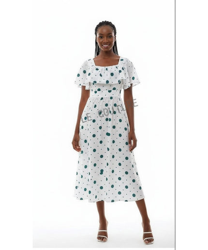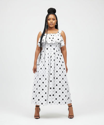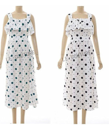 Show off your style in this fashionable sleeveless polka dot dress. Its daring, yet elegant design allows you to make a statement without compromising your comfort. Exude confidence and be the center of attention wherever you go.