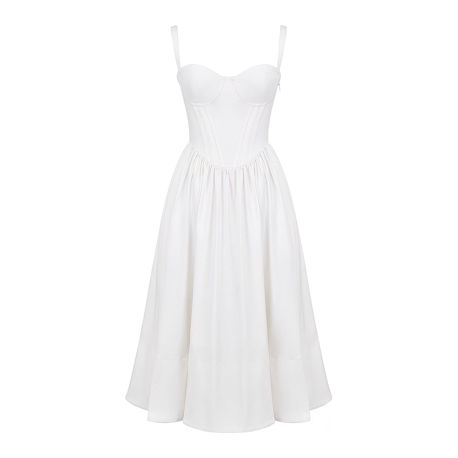Spaghetti Strap Corset Midi Dress. "Crafted from high-quality materials, this dress is designed to provide the perfect blend of comfort, style, and support. The adjustable spaghetti strap design allows for a customized fit, while the corset shaping enhances your natural curves. Whether you're dressing up for a special occasion or looking for a chic everyday option, this midi dress has got you covered."