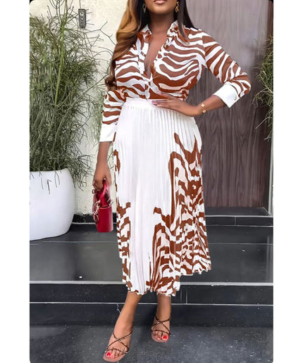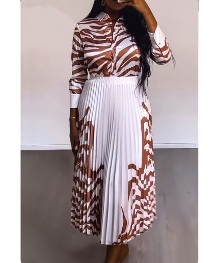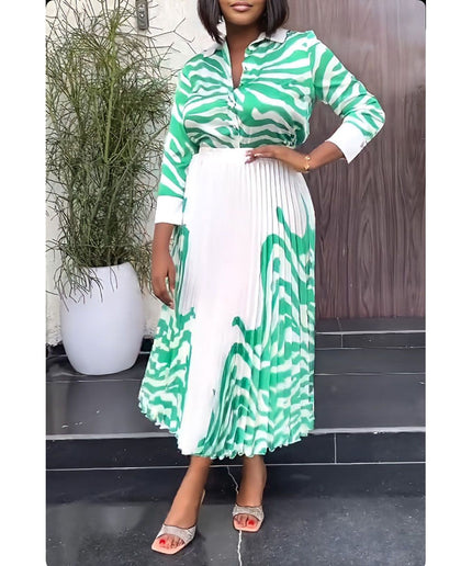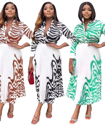 If you're looking to make a statement and stand out from the crowd, this striped pleated skirt and long sleeve top set is the perfect choice. The modern and stylish silhouette, along with the fashionable color palette, makes it a timelessly elegant piece to any wardrobe. This eye-catching set has an undeniable allure that will leave you feeling sexy and glamorous.