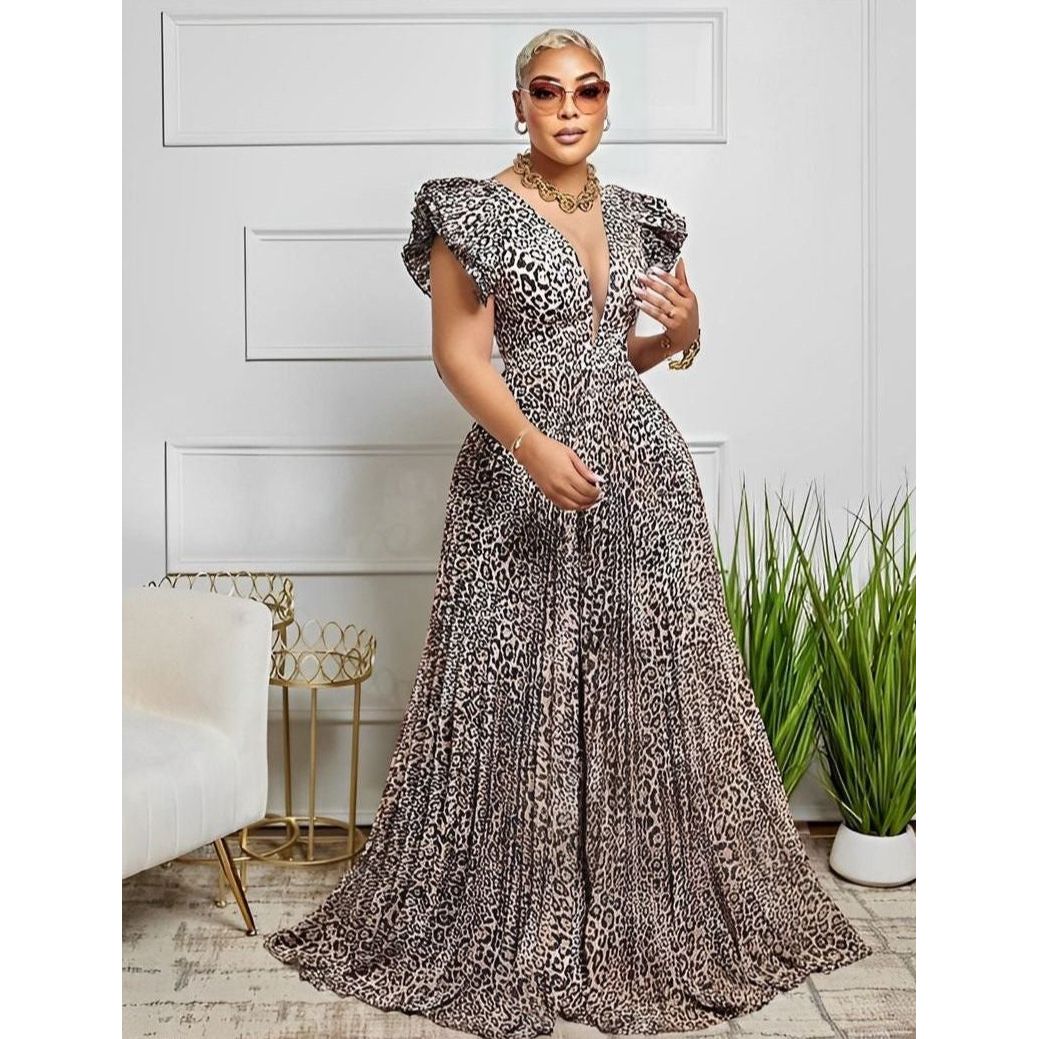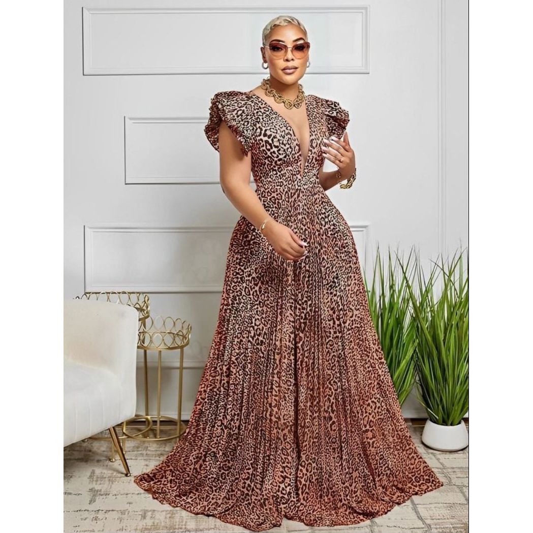 The jumpsuit's design features a classic leopard stripe pattern paired with a flattering V-neck and stylish button details. With its versatile and trendy style, this jumpsuit is perfect for any occasion.