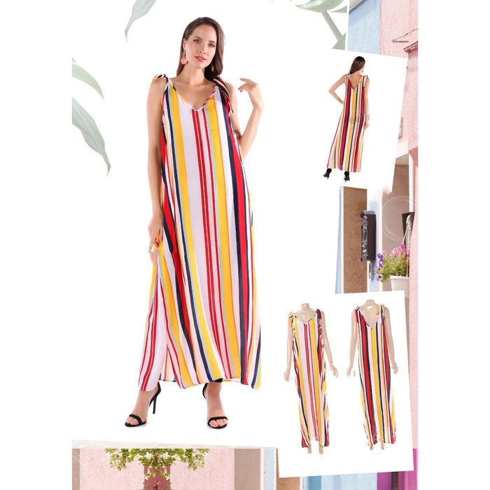 Tied Shoulder Striped Maxi Dress With its classic striped design and flattering tied shoulder detail, this maxi dress effortlessly combines style and comfort. Made from high-quality materials, it's a versatile piece that can easily be dressed up or down for any occasion. Perfect for those who value both fashion and practicality, this dress is a must-have addition to any wardrobe.