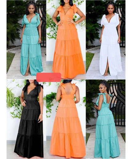 Make a sophisticated statement with this elegant V-Neck Button Detailed Front Slit Dress. Crafted with a stylish v-neck, detailed buttons, and an elegant slit, this dress is sure to add a hint of luxury to any wardrobe. Perfect for any occasion, this dress exudes class and sophistication.