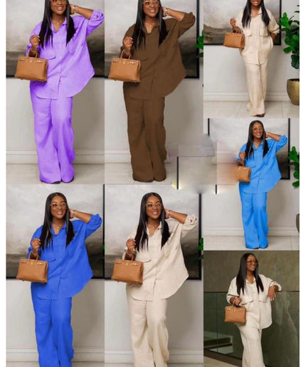 V-neck Loose Top & Formal Pant Set. This top and pant set offers a versatile, polished look for any occasion. With its loose fit and V-neck design, it provides both comfort and style. Pair it with heels and accessories for a formal event, or dress it down with sandals and a statement bag for a more relaxed outing. You'll never run out of ways to wear this timeless set.