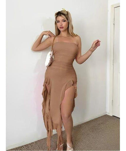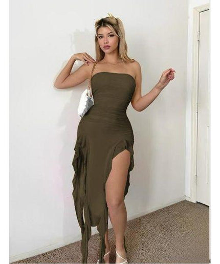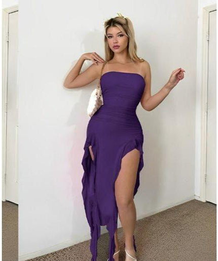 The Women's Double Slit Hem Tube Top Dress is a versatile and stylish addition to any wardrobe. With its double slit hem design, this dress provides unrestricted movement while maintaining a chic and modern look. Made with high-quality materials, it is durable and comfortable to wear. Perfect for any occasion, this dress is sure to make you stand out and feel confident.
